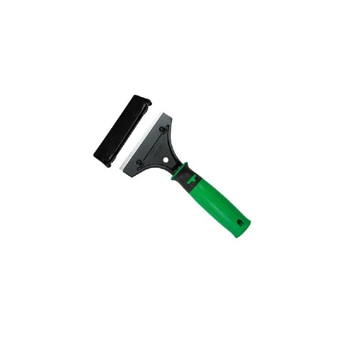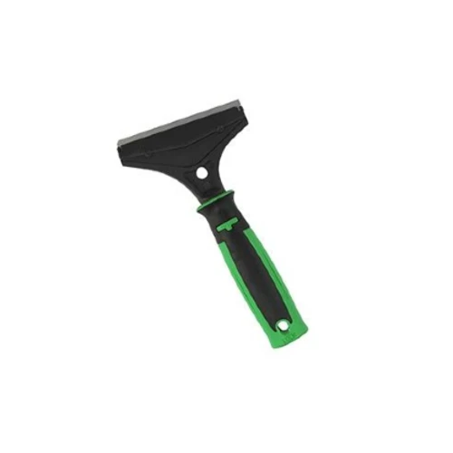 Raspador de superfície ergonómico. Com cabo bipartido. Ergonomia: Pega de plástico confortável. Potência: Cabeça de metal robusta e angulada. Eficiência: Lâmina com uma borda afiada de um lado e uma borda romba do outro.